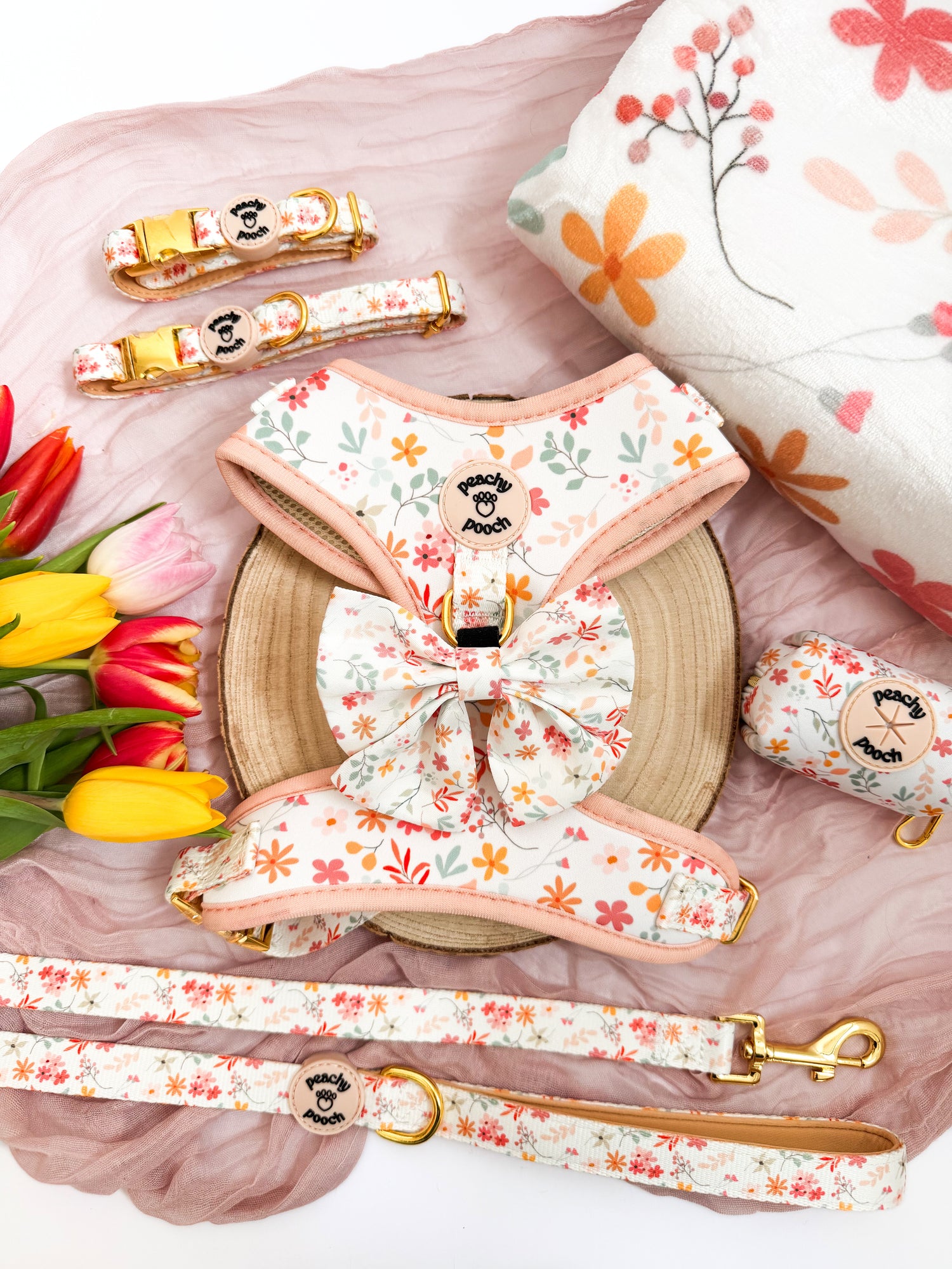 Soft florals meet everyday elegance. The Floral Bloom collection features beautifully designed harnesses, collars, and accessories with delicate flower patterns and gold hardware. Perfect for pups who love to step out in style.